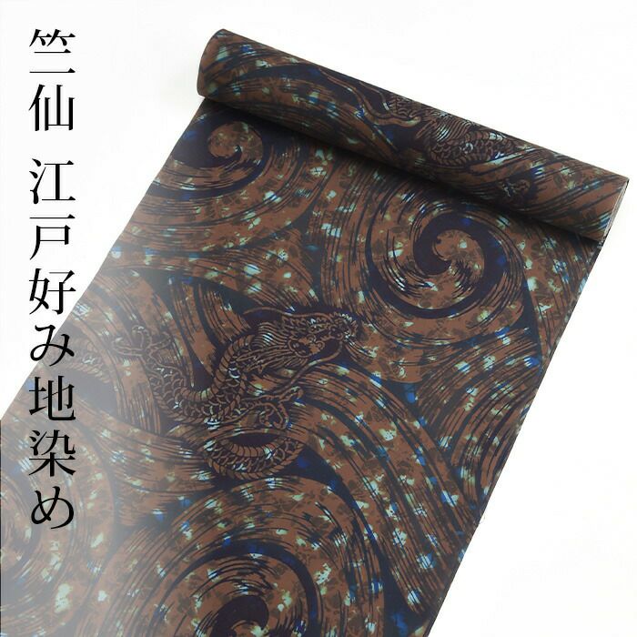 男性や裄の長い方にもオススメの幅広生地。紺地に茶色で描かれた龍がおしゃれ。差し色の青色が涼し気な印象に。