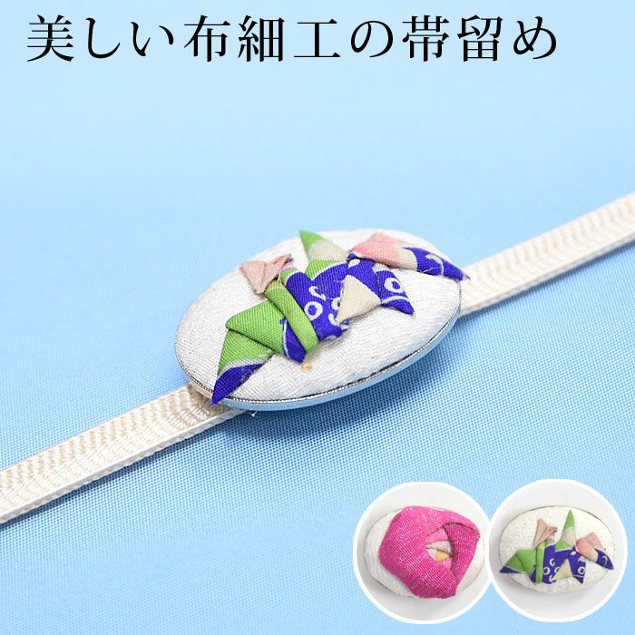 犬やネコなどの動物モチーフや折鶴、櫛などの古典柄。様々なモチーフに目を奪われる。ハギレを組み合わせてつくった凝った布細工の帯留めは、レトロかわいい雰囲気に。