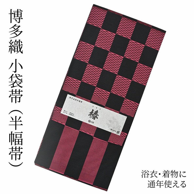 博多織 半幅帯(小袋帯) 長尺 森博多織 謹製 「椿」 正絹 市松(赤黒) リバーシブル