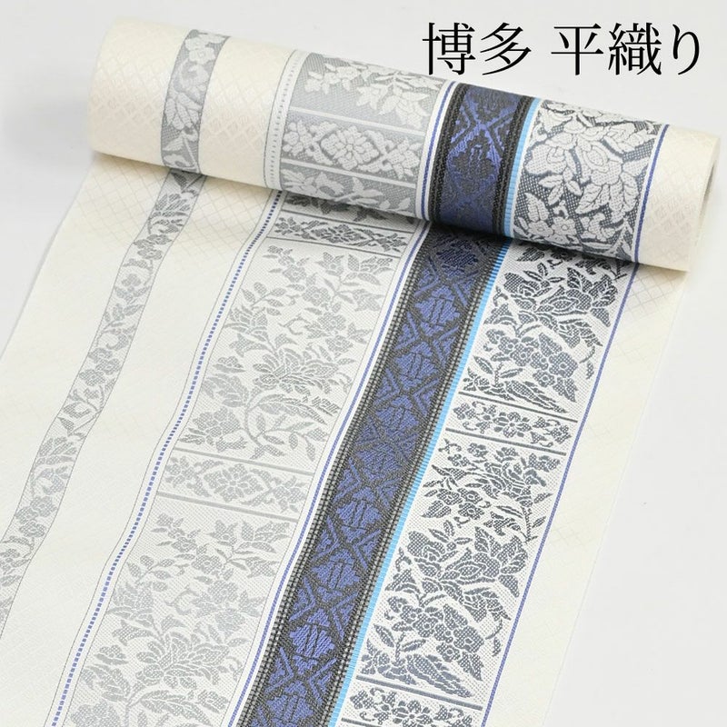 しっかり目の詰まった地風が特徴の博多帯。絹鳴りの音、美しい光沢も魅力です。さし色にも注目。現代のデザイン、感性が伝わる配色がおしゃれ。