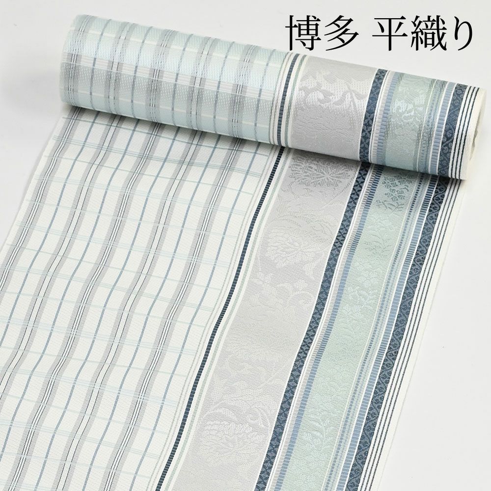 しっかり目の詰まった地風が特徴の博多帯。絹鳴りの音、美しい光沢も魅力です。さし色にも注目。現代のデザイン、感性が伝わる配色がおしゃれ。