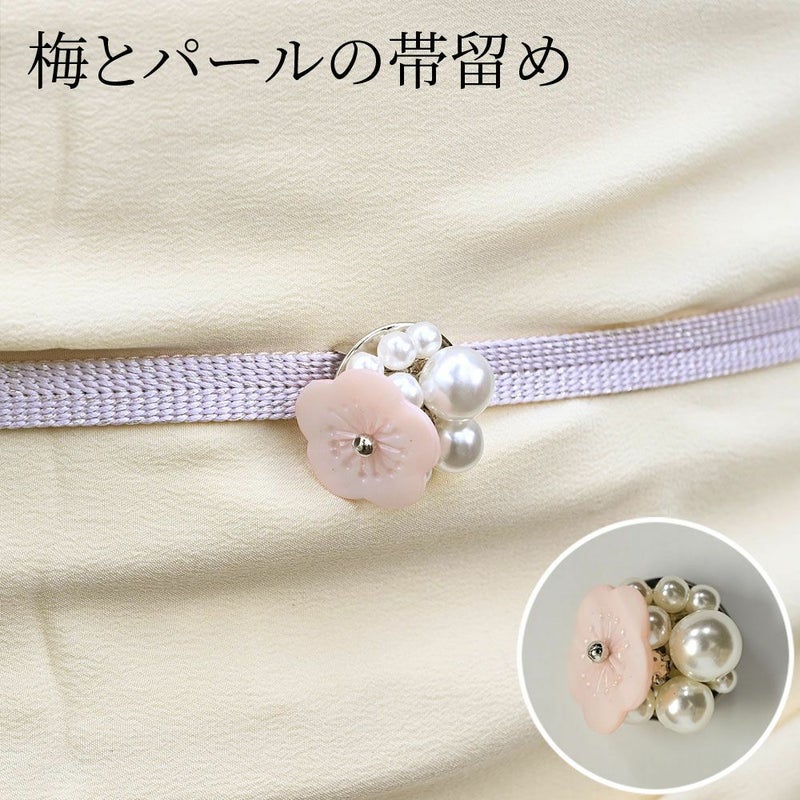 華やかなパールと、螺鈿(らでん)素材の梅の花が可愛らしい、上品な印象の帯留めです。大人の女性の上品なイメージを引き立て、より美しい印象を与えてくれます。