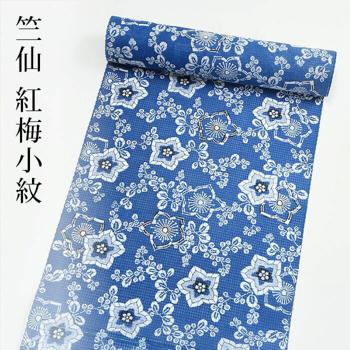透け感が美しい紅梅小紋。さらり涼しく夏きものとしてもお召しいただける高級感。青地に、可愛らしい竜胆の花に、萩の葉っぱがおしゃれなアクセント。