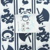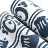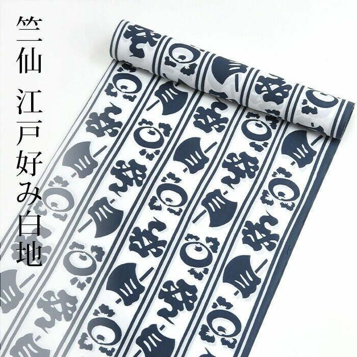 男性や裄の長い方にもオススメの幅広生地。白地に紺の斧・琴・菊が粋な柄。「良き事を聞く」は尾上菊五郎の柄で「かまわぬ」と共に人気のある歌舞伎古典柄です。