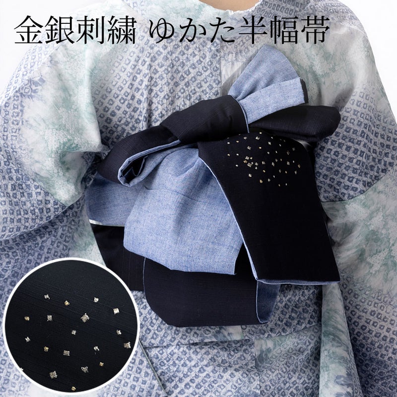 浴衣 帯 リバーシブル 刺繍 半幅帯 星 あられ 紺