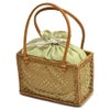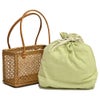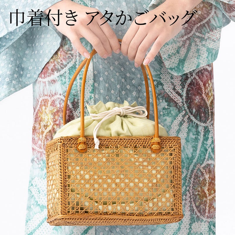 アタ素材で製作したデザイン製のあるかごバッグに、綿麻生地のグリーンの巾着を入れた、夏らしいオシャレなかごバッグです。