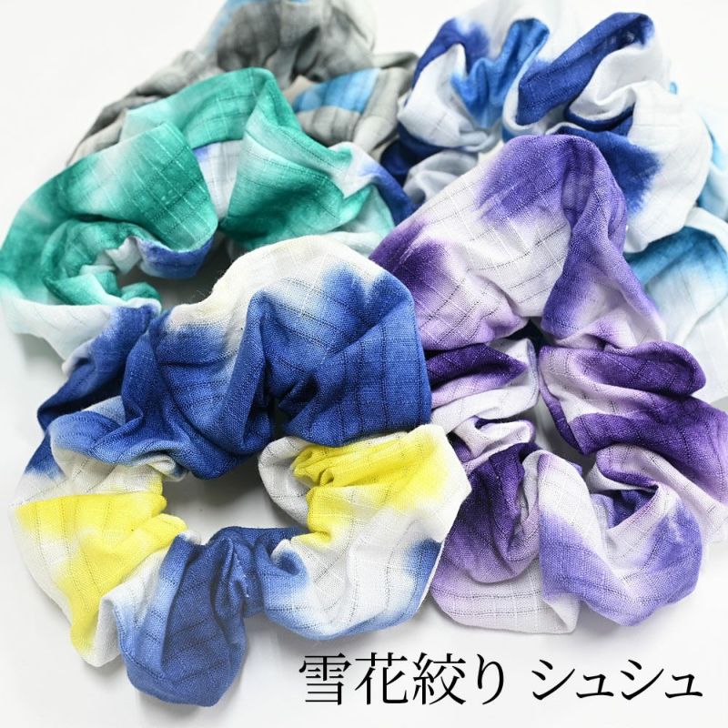 有松絞りの技法の一つ、雪花絞りをほどこした生地を使用してシュシュをおつくり致しました。コットン100%の心地よい柔らかな肌ざわりです。