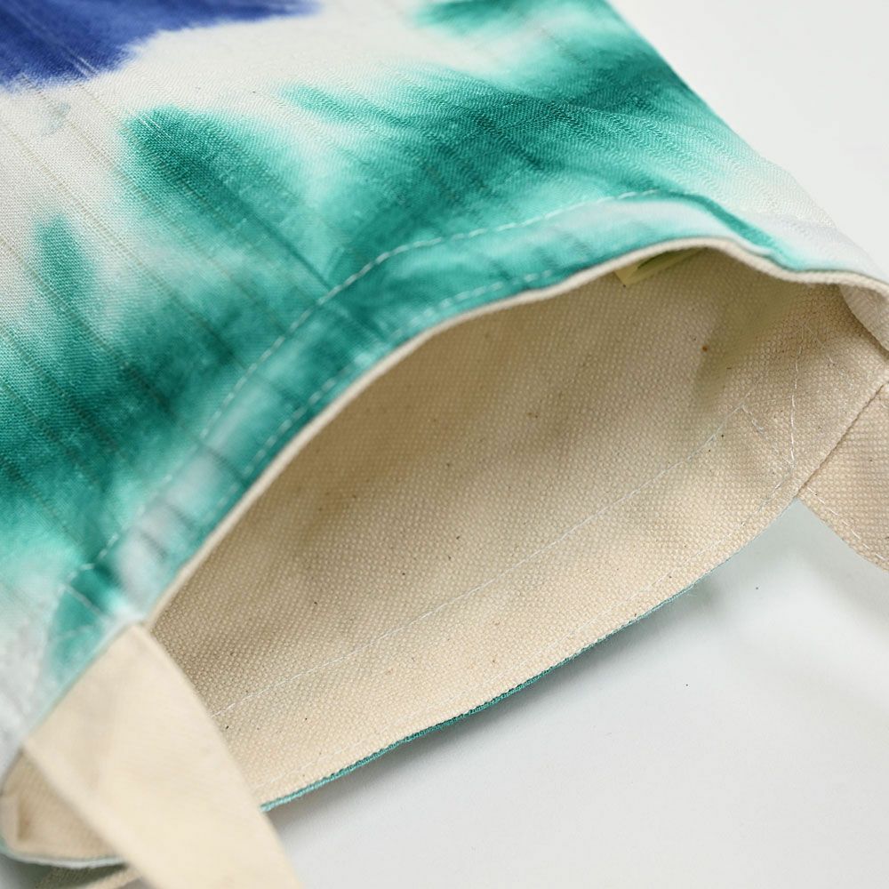 有松絞りの技法のひとつ「雪花絞り」をほどこした生地を使用。味わいある染めの色合いも魅力。コットン100%なので汚れてもサッと洗えるのもうれしいポイント! ※生地の取り方によって、色柄の位置が画像と異なる場合がございます。
