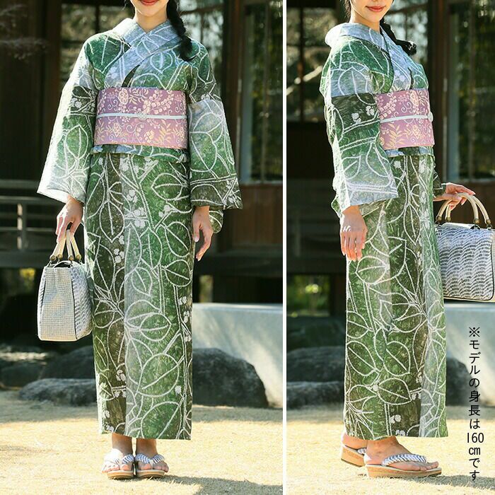 ご自分の身長が、サイズ表の適応身長の約-3cmほどであれば、ご着用できます。着付けの際は、腰紐の位置を高めにして着付けてみてください。