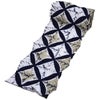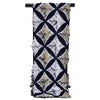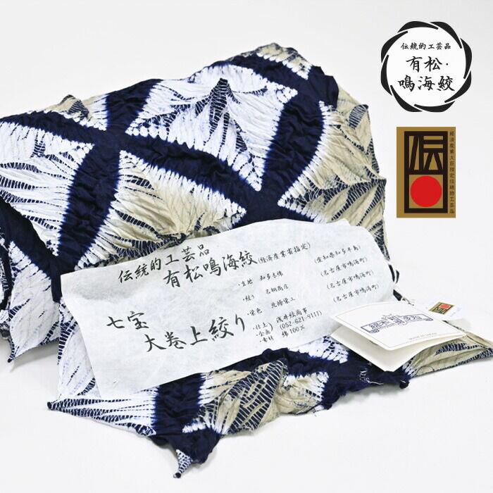 巻き上げ絞りと縫い絞りで表現した大き目の七宝柄。古典柄ですが、白地に紺とベージュの配色によりおしゃれでモダンな雰囲気に。