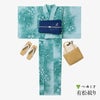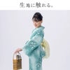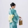 青みがかったグリーンの濃淡。花の部分がほわんと浮かびあがり、シンプルながらも清潔感のある可愛らしい印象を与えてくれる。白、ピンク、紫、濃い紺や黒など様々な帯を合わせてコーデを楽しんで。シルケット加工済のやわらかい綿100%生地。