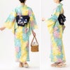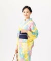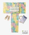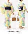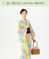 彩度の高い黄色地に、青グリーンの葉とピンクのお花が思いきりトロピカルな雰囲気。決して派手すぎない色合いの絞り染め浴衣は、花火大会などのイベントや、リゾート着として活躍。シルケット加工済のやわらかい綿100%生地。