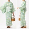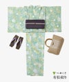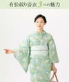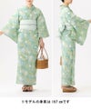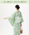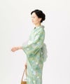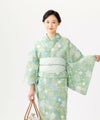 全体に散らされたお花モチーフと、グリーンと黄色を細く斜めにかけた染めが、まるでワンピースのように可愛らしい1枚。単衣~夏の着物として装っても華やかでおすすめ。シルケット加工済のやわらかい綿100%生地。