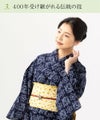 一目鹿の子絞りで表現された、桔梗麻と独自の文様が整然と並び、吸い込まれるような美しさ。絞りが映えるよう、潔く濃紺地に染めて。高級感ある装いを楽しめるので、夏着物としても活躍。末永く着られる1枚。シルケット加工済のやわらかい綿100%生地。