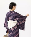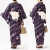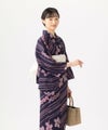 巻き上げ絞りの桜、味のある丸い唐松絞り、縫い絞りを斜めに配した滋味深い浴衣。グレー味のある紫地に、絞りをほどこした部分はピンクを挿して。染めと絞りの技法を駆使した希少な1枚となる浴衣。たてに縞のように筋が入るしっとりやわらかな変わり生地。