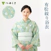 全体に散らされたお花モチーフと、グリーンと黄色を細く斜めにかけた染めが、まるでワンピースのように可愛らしい1枚。単衣~夏の着物として装っても華やかでおすすめ。シルケット加工済のやわらかい綿100%生地。