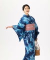 花火のような、菊のような柄が咲き乱れる華やかな1枚。ブルーの濃淡も際立ち、遠目からでも映えて夏のイベントの主役になれそう。帯や小物を変えてひと夏楽しんで。シルケット加工済のやわらかい綿100%生地。