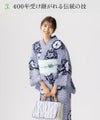 細やかな三浦絞りに浮き立つ、朝顔や百合、小菊などの流れる花が美しい。絞りが映えるよう、いさぎよく紺の単色で染めて。有松絞りの歴史と伝統を楽しめる。帯の合わせ方によって末永く着られる永遠の定番。シルケット加工済のやわらかい綿100%生地。