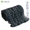 細やかな鹿の子絞りで表現した辛口な幾何学模様。濃いグリーン地に黒をかけ染めし、単色染めでは表現できない、奥行きのある雰囲気に。男女問わず粋に着こなせる色柄で、単~夏着物としても活躍。シルケット加工済のやわらかい綿100%生地。