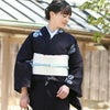 20周年イヤーに、つゆくさのモチーフを型から起こし制作した完全オリジナル作品。濃紺の地にほんのり青みのあるグリーンと、濃い紫に抹茶色の2色。すっきりシンプルな飛び柄。ランダムなたて絽のような綿100%の変わり生地で、夏着物としても活躍。