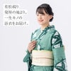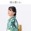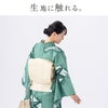 四角いモチーフの中に刻まれた笹の葉が印象的。家紋のように厳かながらも、グリーンの濃淡でカジュアルに気負わず着られる。やや大きめの飛び柄で、夏着物として楽しむのもおすすめ。ランダムなたて絽のような綿100%の変わり生地を使用し、より高級感あふれる装いに。