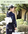 ぷっくりと愛嬌のあるトンボの姿がなんとも可愛らしい。濃紺地に、白とブルーが映えて涼しげな印象。飛び柄なので夏着物としてもオススメ。ランダムなたて絽のような綿100%の変わり生地を使用し、より高級感あふれる装いに。